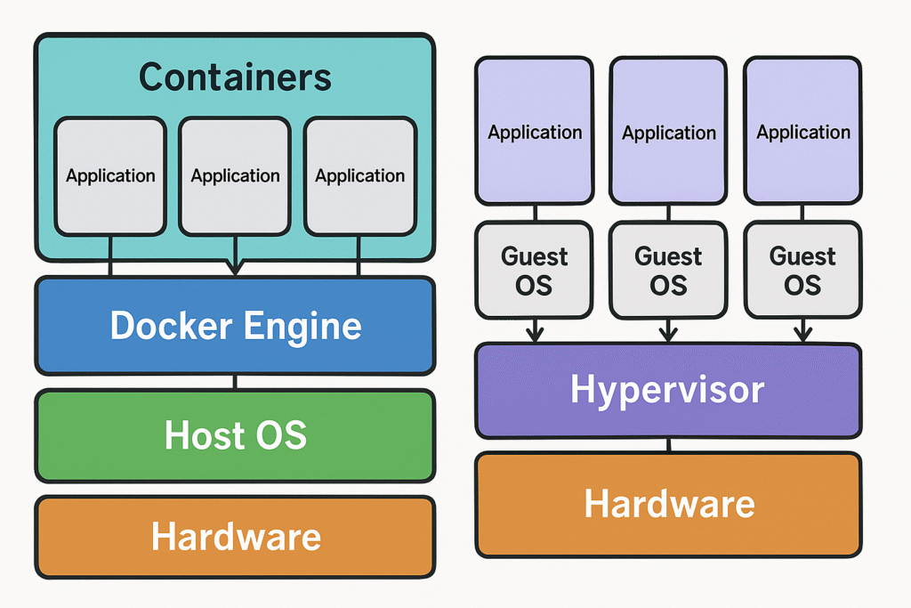 In contrast, Virtual Machines emulate complete hardware environments, each running its own guest operating system on top of a hypervisor. This approach offers stronger isolation and the flexibility to run different operating systems side by side. However, this comes at the cost of increased resource consumption and slower startup times compared to containers.